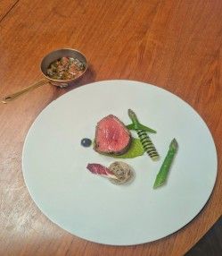 Reheat potato & mutton in the oven if necessary. Add one spoon of romesco on the plate in the centre, spread with a step palate knife, pipe small lines of black garlic ketchup over one asparagus spear on a rack, add to the plate. Pipe dot of garlic ketchup on plate. Place the confit potato on a plate. Carve mutton, season with sea salt, add to the centre of the plate. Sauce all around with sauce vierge.